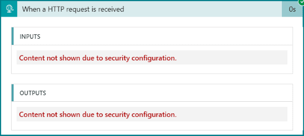 Interestingly, some actions like Parse JSON only have Secure Inputs setting. Because of that enabling secure input automatically secures the output as well. In case secured input setting was not enabled but action received secured output from previous action then this action will be obfuscated but all downstream actions won’t. If downstream actions should be secured make sure secure inputs are enabled on this action as well.