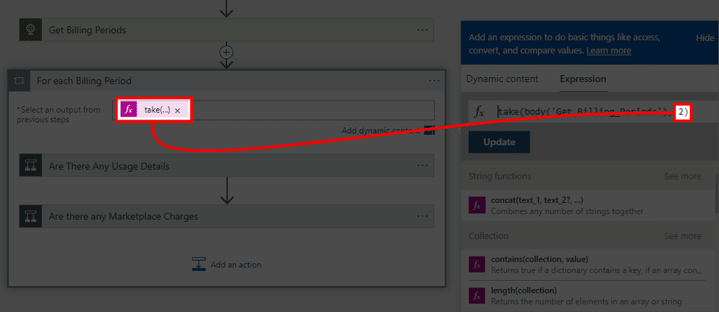- Find the value 2, which can be found in in the For each billing period action as expression take(…) and simply change it to bigger number, and run it once.