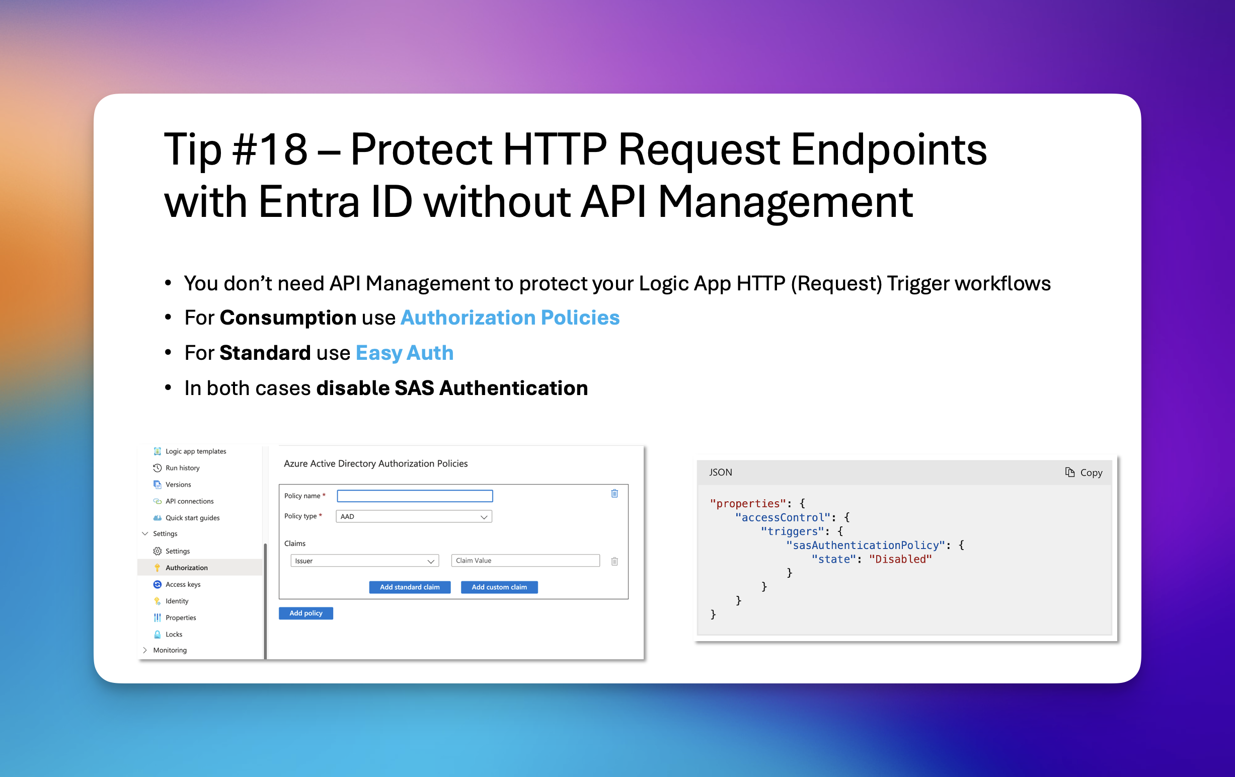 Authorization Policies is a way to allow users and solutions to authenticate to your logic app HTTP endpoints using Entra ID (service principals / managed identities). It’s just a few clicks on done.