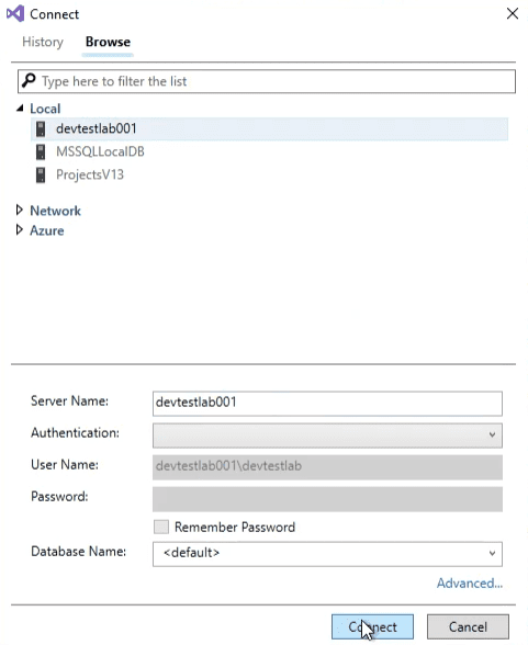 - Visual Studio model which connects live to on premises database