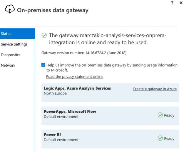 - On-Premises Data Gateway installation - windows service used for connectivity
