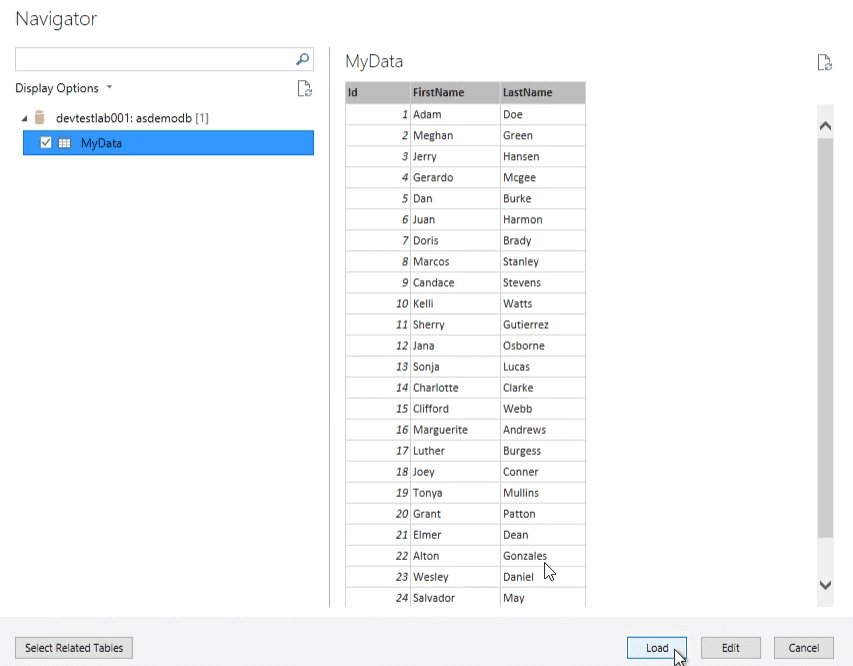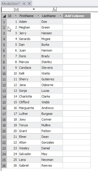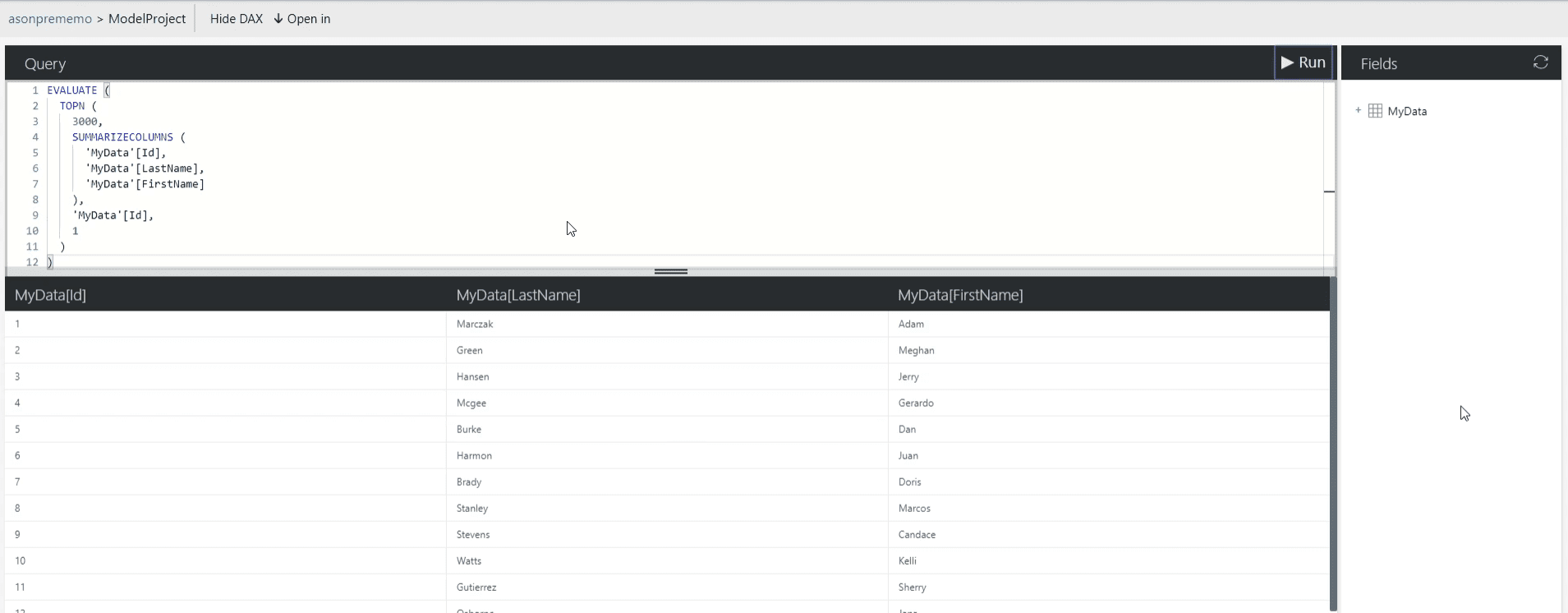 EVALUATE ( TOPN ( 3000, SUMMARIZECOLUMNS ( 'MyData'[Id], 'MyData'[LastName], 'MyData'[FirstName] ), 'MyData'[Id], 1 ) ) - Verify results