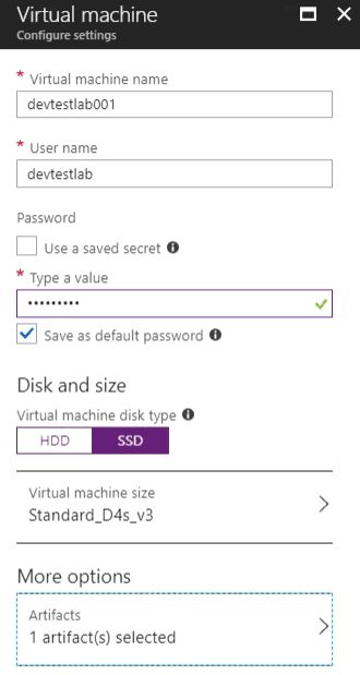 - Virtual Machine Name: devtestlab001, name is important when connecting to SQL server later on. Any name works though.
