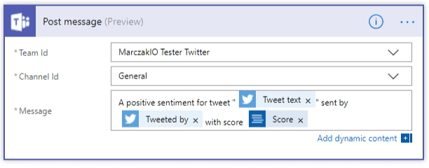 - Message: Message that will be posted. In case of this demo ‘A positive sentiment for tweet [Tweet Text] sent by [Tweeted by] with score [Score]’