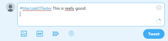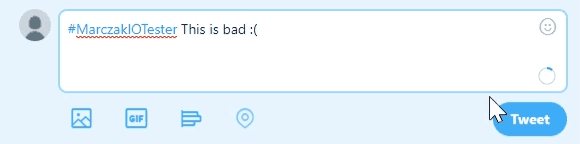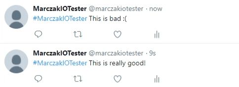 - Type in sentence or hashtag for analysis. For purpose of this demo #MarczakIOTester was used. In cases of companies it’s usually hashtag with their company, products or events names.