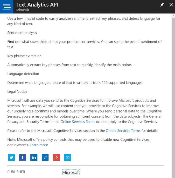 Building brand visibility requires a lot of effort. Analysis of social media reactions is key aspect of this process. With Azure Cognitive Services Text Analytics API companies can start analyzing feedback right away with ease.